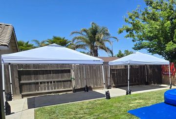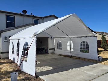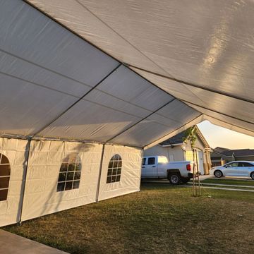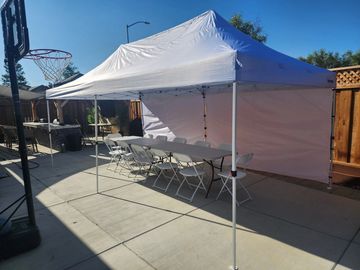 Need a break from the scorching sun or unpredictable weather for your upcoming party? Look no further than the 10ft x 20ft popup tent! This versatile option is ideal for compact areas or even your own driveway. We do have walls or lighting available. White in color.