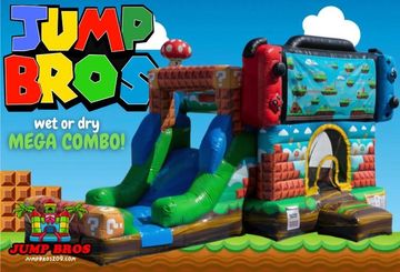 NEW ARRIVAL! We are proud to present the Jump Bros Mega Combo, our new largest Bounce House/Water Slide Mega Combo! This combo is perfect for the Gamer in your life! This is by far our largest combo measuring 33 feet long, 13 feet wide, and standing 14 feet tall. This gaming-themed slide features bright, eye-catching colors and either pool for hours of water fun or an inflated stopper for tons of dry fun!