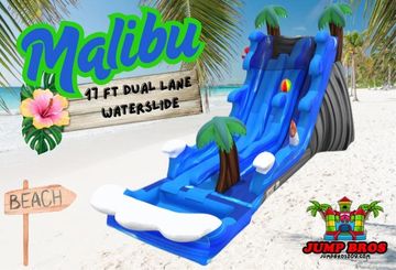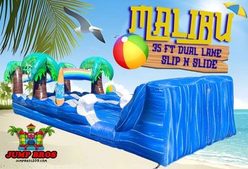 NEW ARRIVAL! Say hello to a first in the Jump Bros Inventory, the Malibu 35ft Dual Lane Slip N Slide! This new Slip N Slide is perfect to beat the heat this summer! This is a very large inflatable measuring 35 feet long, 11 feet wide, and it stands 9 feet tall, the new addition to the Malibu Collection features our most popular Hawaiian theme and 2 35ft lanes for tons of water fun!