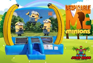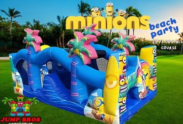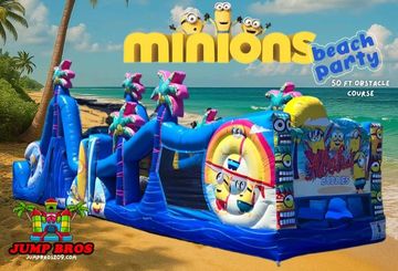 Experience the ultimate Minion adventure with the Minions Beach Party 50ft Obstacle Course! This massive inflatable combines the excitement of a beach-themed Minion party with a 25ft obstacle course and a dual lane water slide. Featuring a climbing wall, bouncing area, small slide, large dual bounce house water slide rental water slide rental , and everyone’s favorite Minions.