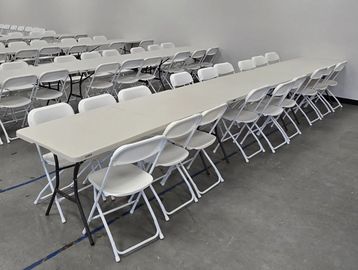 We are happy to offer 6 ft white tables and white chairs for you next event!