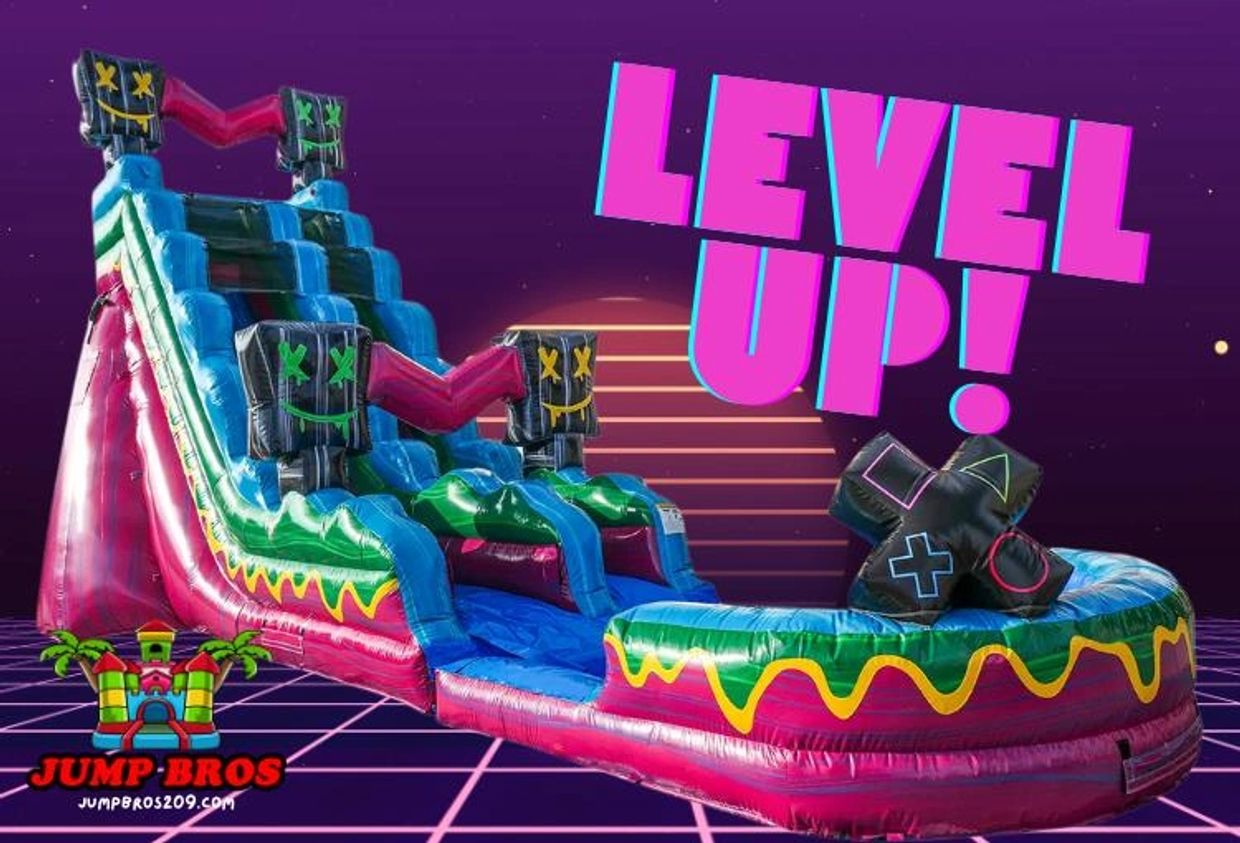 Get ready for the ultimate water slide experience with Level Up! This towering 19-foot slide spans 37 feet in length and 15 feet in width, offering an exhilarating adventure for kids, teens, and adults alike. Featuring vibrant, gamer-inspired designs and a massive pool at the bottom, this slide is sure to be a hit at any event. Ideal for those 48 inches and up, Level Up! is perfect for summer parties and gatherings, providing hours of fun and excitement.