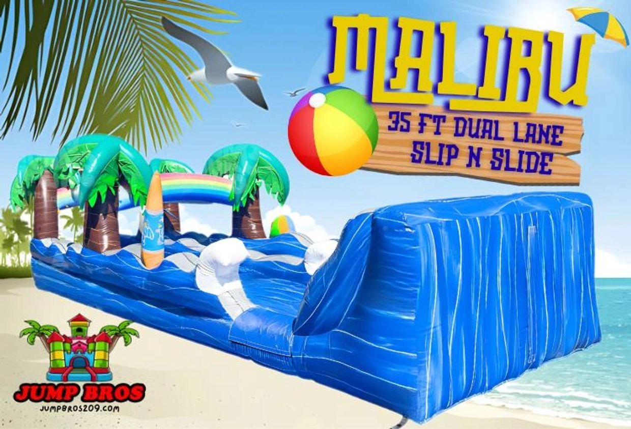 Say hello to a first in the Jump Bros Inventory, the Malibu 35ft Dual Lane Slip N Slide! This new Slip N Slide is perfect to beat the heat this summer! This is a very large inflatable measuring 35 feet long, 11 feet wide, and it stands 9 feet tall, the new addition to the Malibu Collection features our most popular Hawaiian theme and 2 35ft lanes for tons of water fun!