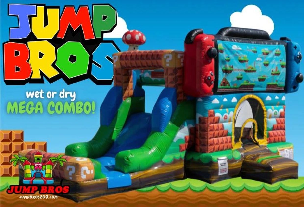 NEW ARRIVAL! We are proud to present the Jump Bros Mega Combo, our new largest Bounce House/Water Slide Mega Combo! This combo is perfect for the Gamer in your life! This is by far our largest combo measuring 33 feet long, 13 feet wide, and standing 14 feet tall. This gaming-themed slide features bright, eye-catching colors and either pool for hours of water fun or an inflated stopper for tons of dry fun!