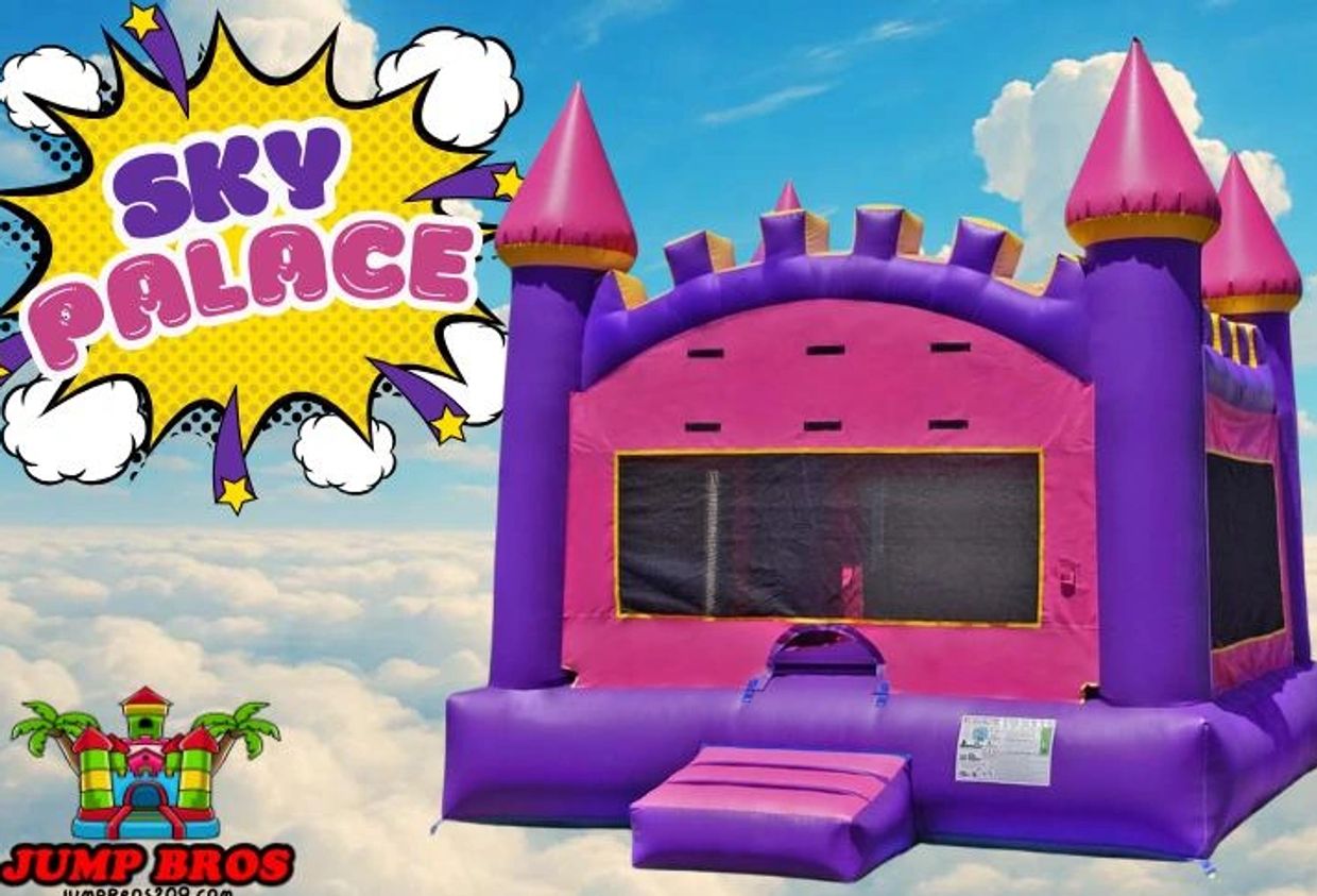 Welcome to the Sky Palace! Immerse your little ones in a world of wonder with our Sky Palace bounce house, a nostalgic design that combines the magic of a castle with the thrill of bouncing excitement. Measuring 13' x 13', it's the perfect playground for all of their adventures! The unique net roof lets imaginations soar as kids bounce beneath the open sky, creating an open-air experience filled with joy. The vibrant purple and pink colors make it a visual delight. Make your event truly magical - reserve the Sky Palace now for a day of whimsical bouncing and enchanting memories!