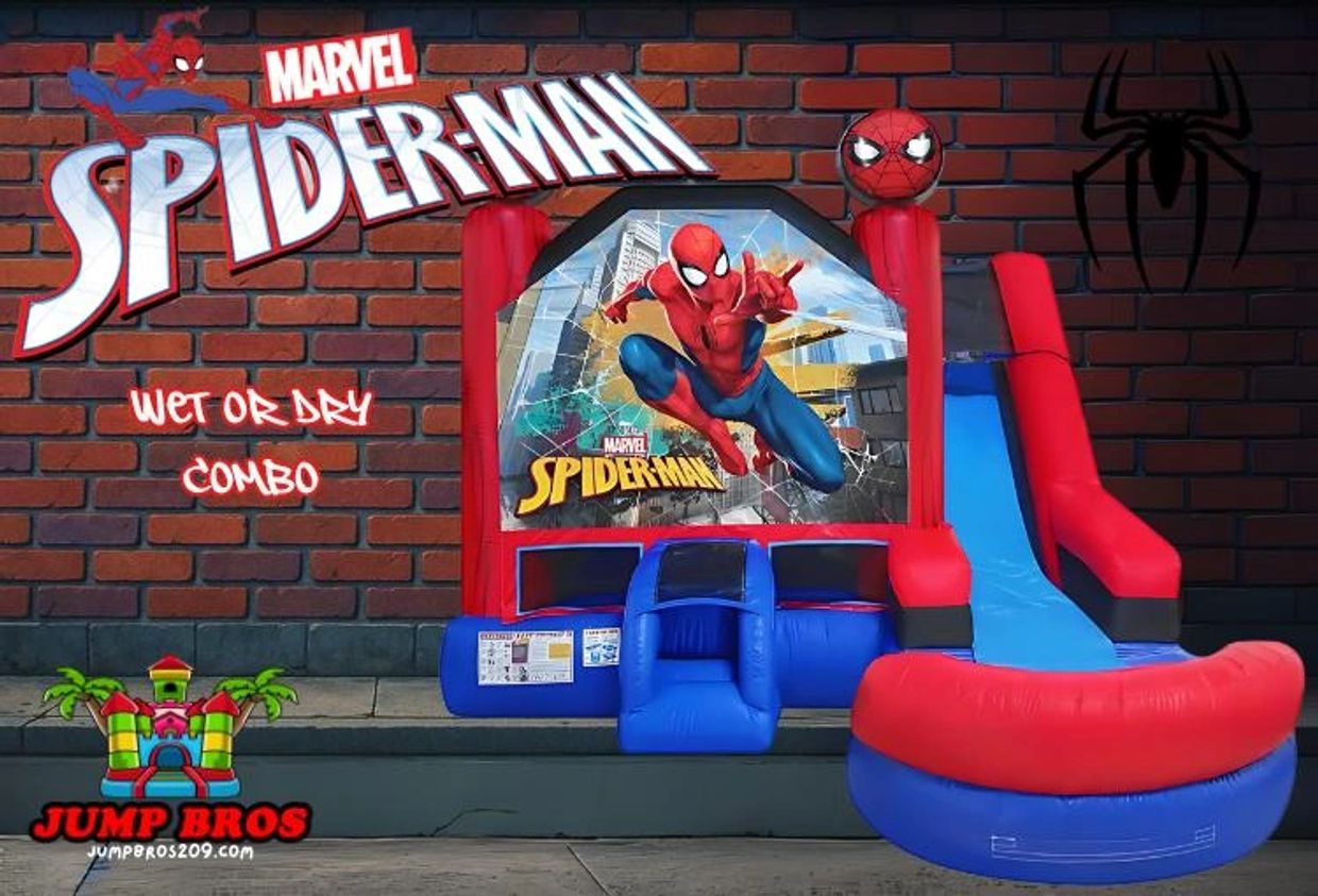 Swing into action with this Wet or Dry Spider-Man Combo! Bounce, climb, slide, and conquer obstacles—all while enjoying a non-slip surface for safety! You can CHOOSE from a dry slide with a ball pit or a slip n slide with a pool full of water!